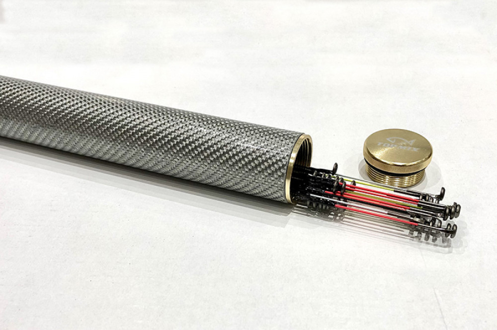 Porta-cimini feeder in carbonio. Design unico e raffinato, tubo realizzato in materiale carbonio multistrato ad alta resistenza per la conservazione sicura dei cimini delle canne da feeder, con tappi terminali metallici filettati su entrambe le estremità.