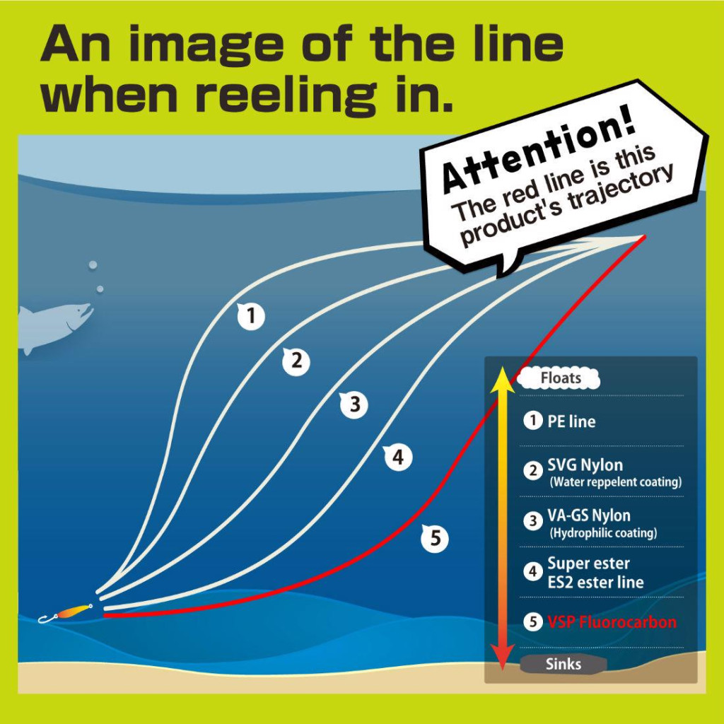 Invisibilità e mimetismo: L'indice di rifrazione del materiale fluorocarbon VSP (Varivas Super Premium) è estremamente vicino a quello dell'acqua, rendendolo quasi completamente invisibile sott'acqua. Questo è fondamentale per ingannare le trote più timide.