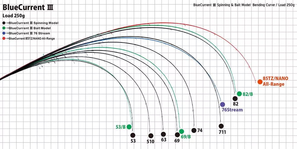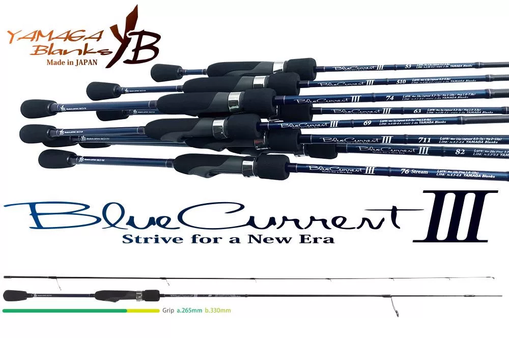 Questa serie rappresenta la direzione principale della linea light game di YAMAGA Blanks. Gli obiettivi di BlueCurrent III includono un punto di lancio più ampio che facilita il lancio, una flessione senza interruzioni che previene la perdita di tensione, e un'estensione della mano del pescatore per una reazione più rapida.